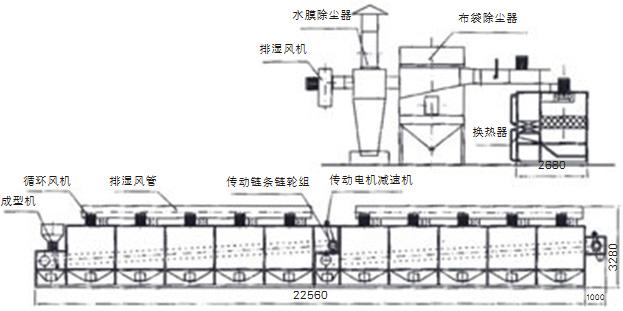 本機是我公司根據(jù)染料等物料壓率后高水分狀固有的特性,設(shè)計出的新型改進(jìn)型網(wǎng)帶式干燥機,一般熱源等放置于右側(cè),工作時,物料先進(jìn)入成形預(yù)熱機構(gòu),擠條造粒,同時也被脫去一部分水分,之后均勻分布在網(wǎng)帶上,干燥時,物料從網(wǎng)帶的上方和下方強制輸入熱風(fēng),使被干燥的每個粒子表面都成為受熱面,增大物料與熱風(fēng)的接觸面積顯著增加導(dǎo)熱面積,使物料內(nèi)部水份擴(kuò)散。組合成的配合使其效率更高,節(jié)能性更好 。
